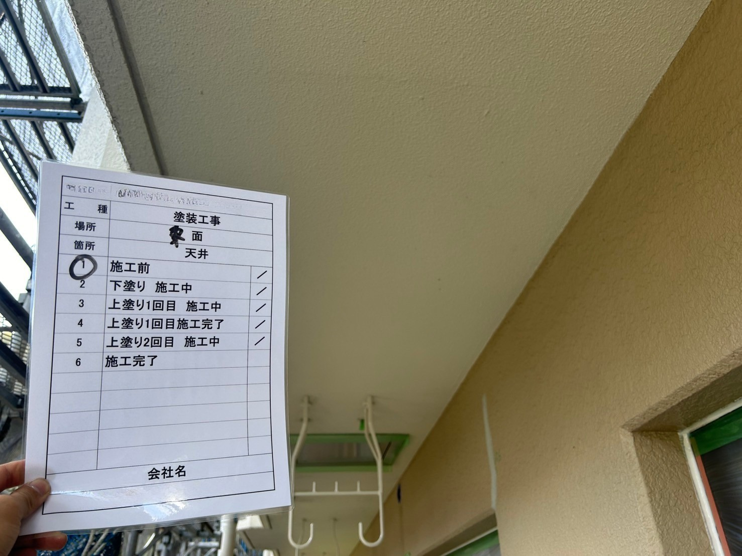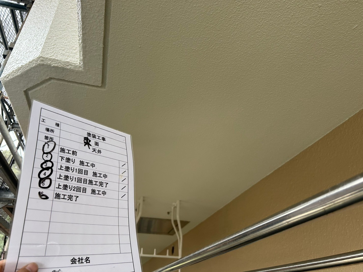 まず、共用廊下などの天井部は、下地処理から下塗り、上塗り2回を丁寧に行い、ムラのない仕上がりを実現。塗装工程の進行状況は、チェックシートで明確に管理しながら進め、安全と品質の確保に努めました。