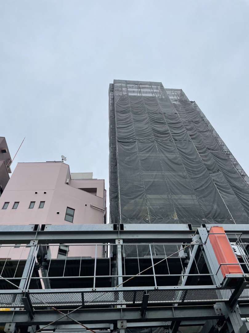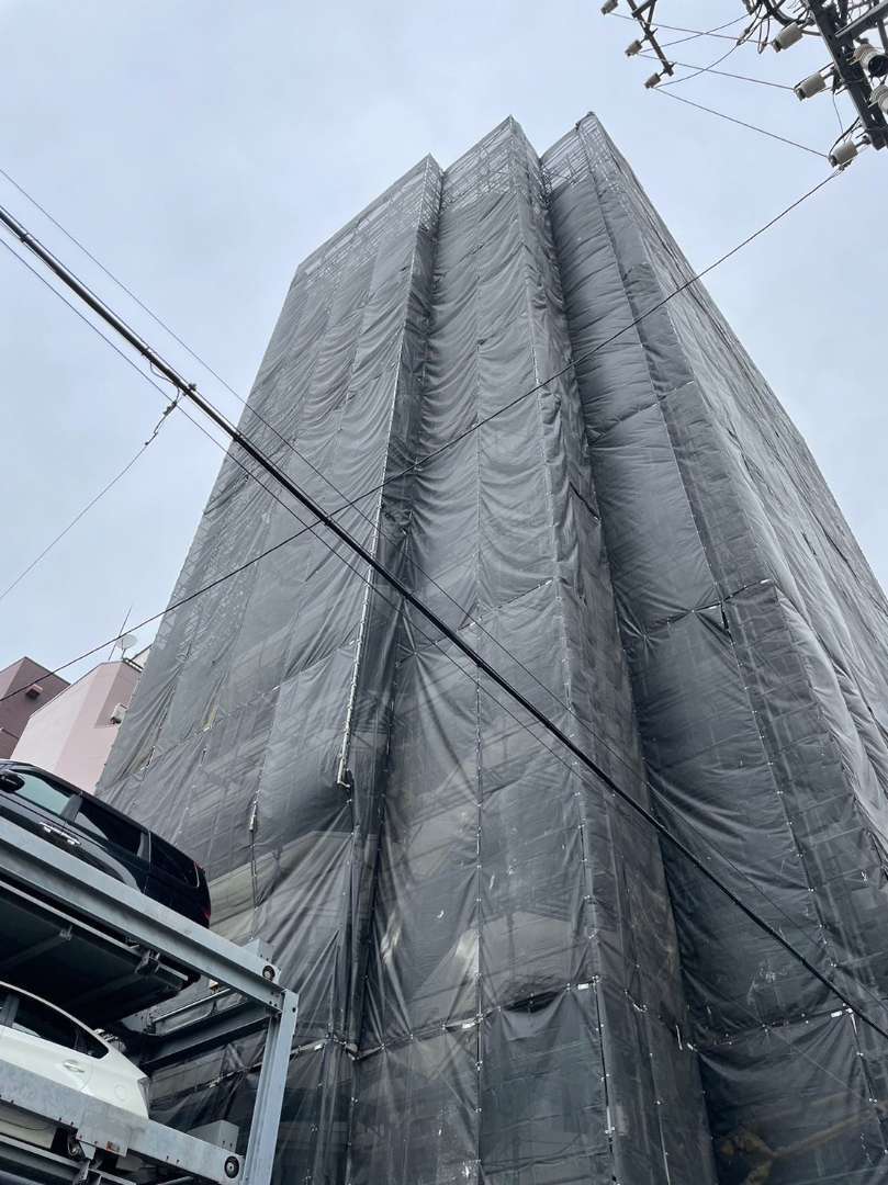 今回の現場は高層マンションであり、安全対策と強度を重視した足場設計が求められました。特に風の影響を受けやすい高さのため、飛散防止ネットのしっかりとした固定や、揺れに配慮した支柱設計など、施工前の計画段階から慎重に対応しております。
