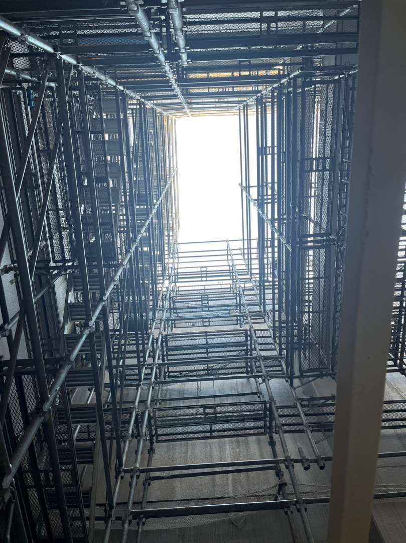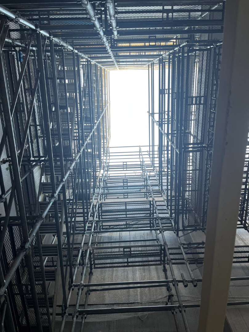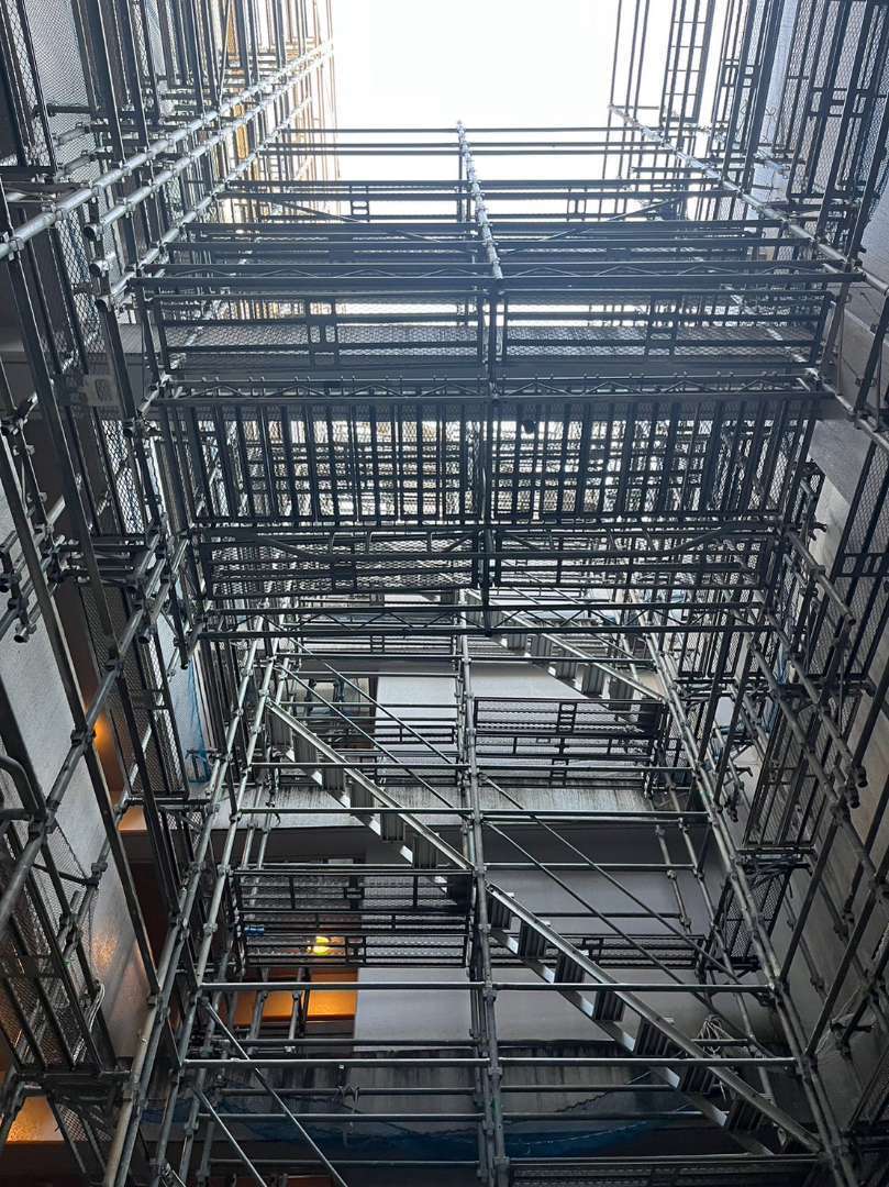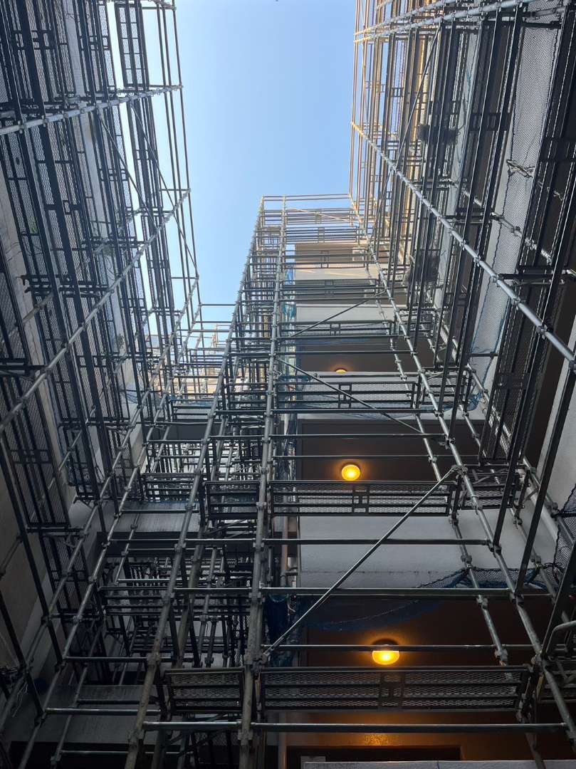 本物件は中層階建ての集合住宅で、吹き抜け構造を含むため、中庭部(ライトコート)への足場設置には特に慎重な計画と技術が求められました。